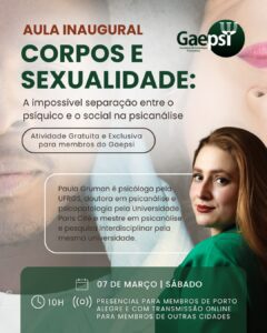 Para refletir sobre essas questões da clínica psicanalítica atual o Gaepsi recebe Paula Gruman, psicóloga e psicanalista, para a sua Aula Inaugural “Corpos e sexualidades: a impossível separação entre o psíquico e o social na psicanálise”.