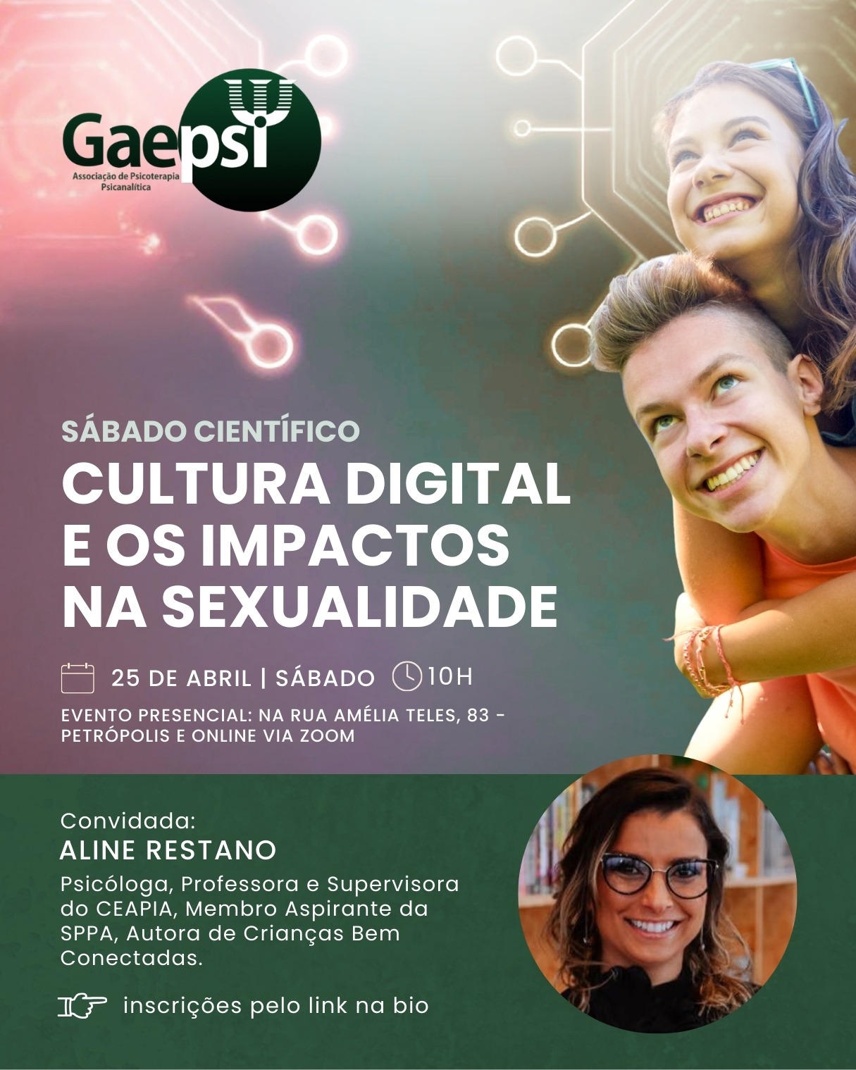 Neste Sábado Científico, o Gaepsi convida você para uma reflexão profunda sobre Cultura Digital e as Transformações da Sexualidade, articulando clínica, teoria e os desafios do nosso tempo.