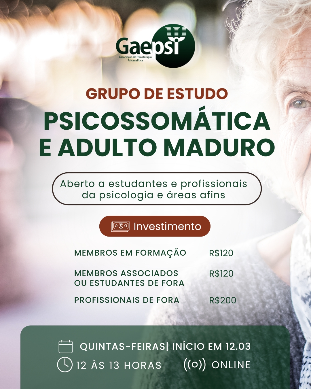 Estão abertas as inscrições para o Grupo de Estudo: Psicossomática e Adulto Maduro, promovido pelo Gaepsi – Associação de Psicoterapia Psicanalítica.